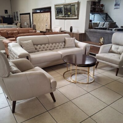 Upgrade your living space with this luxurious Prisely Genuine Leather Sofa, featuring a 3-seater sofa and two matching armchairs. Upholstered in soft, durable Turkish nubuck leather, this elegant set combines comfort and contemporary style with its tufted backrest, curved armrests, and solid wood legs for a touch of mid-century charm. The neutral beige color complements…