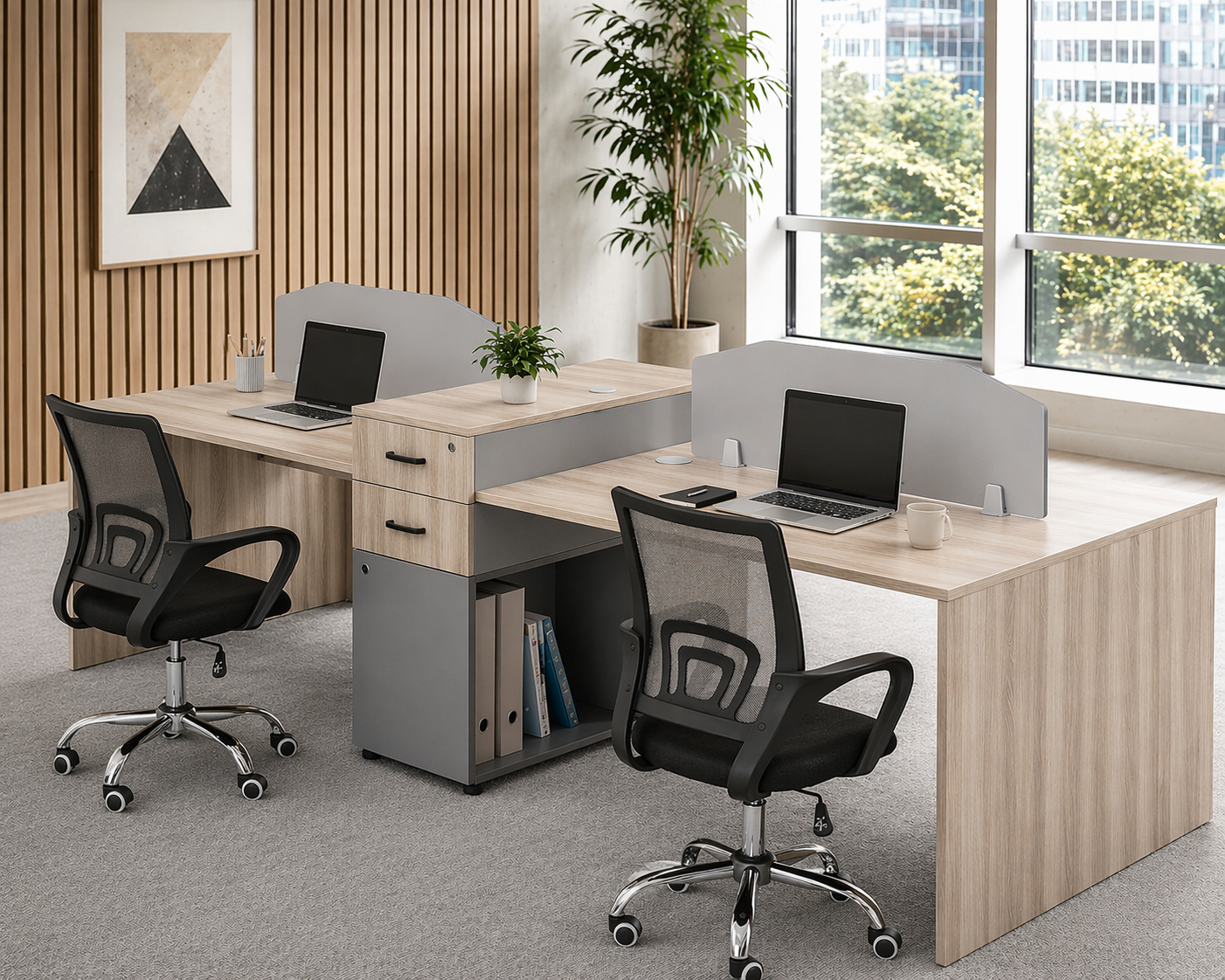 - Elegant & Durable Design – Crafted from premium wood grain laminate, this workstation blends seamlessly with contemporary office décor.