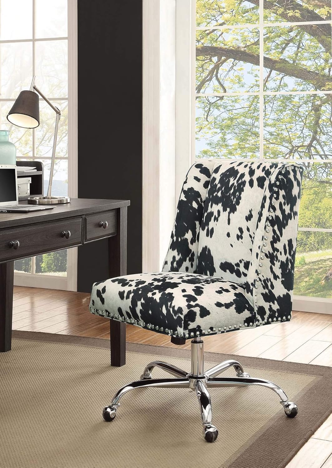 This striking office chair is a unique blend of rustic charm and modern functionality. It is upholstered in genuine cowhide leather, a bold and classic material that makes it a true statement piece for any home office or workspace.