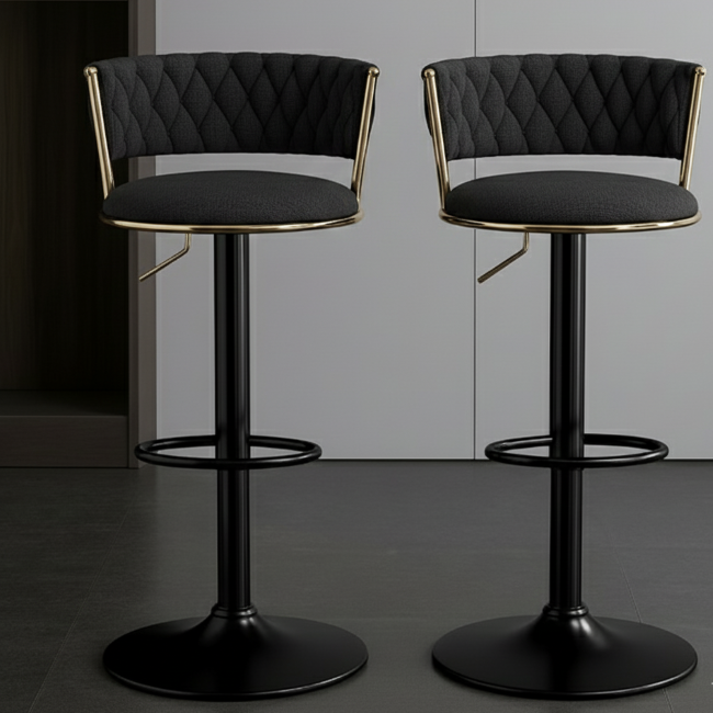 Elevate your kitchen with luxury adjustable bar stools (Set of 2). Featuring quilted upholstery, gold glam accents, swivel, and hydraulic height adjustment.