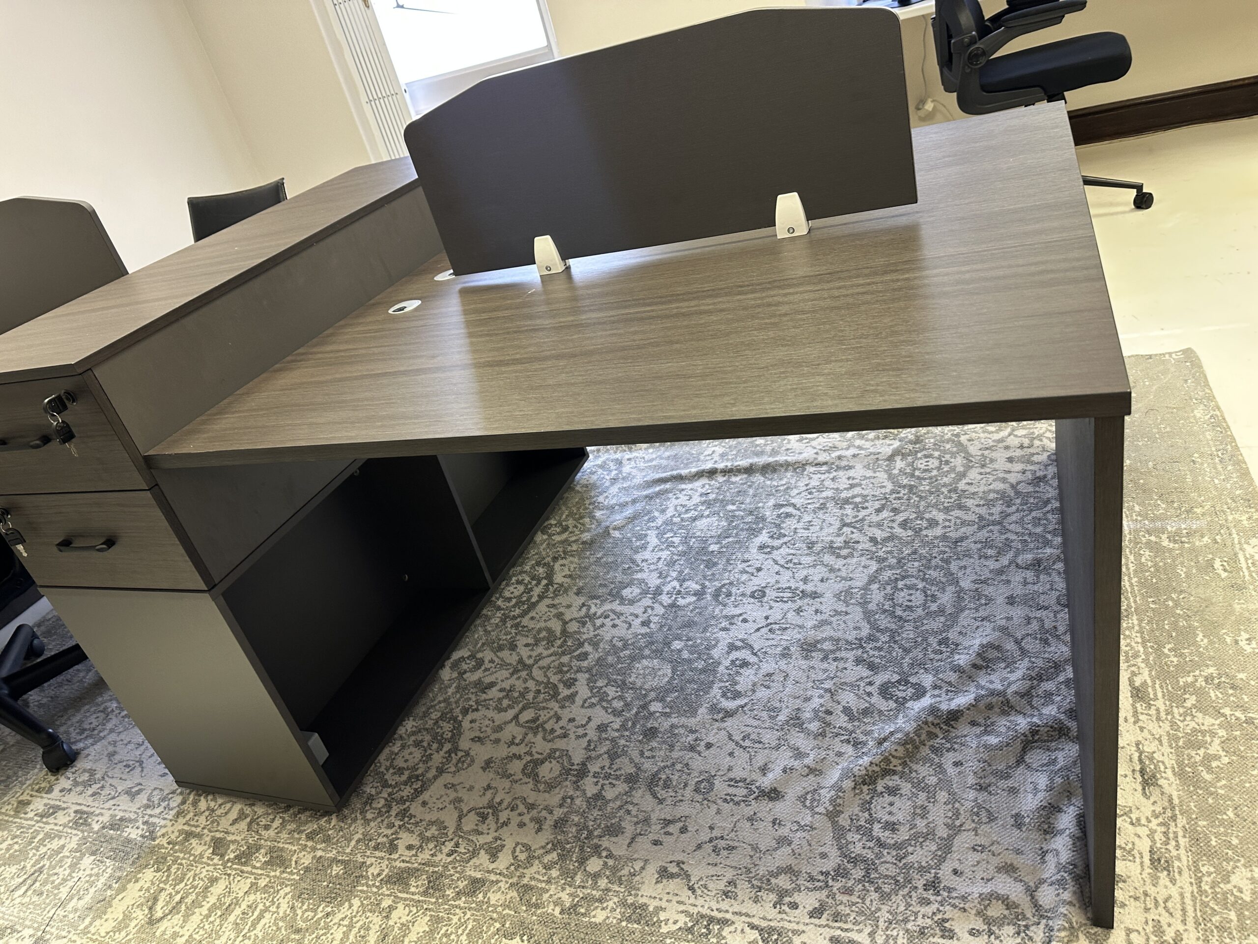 4-seater office desk with dividers and drawers.