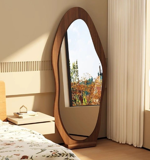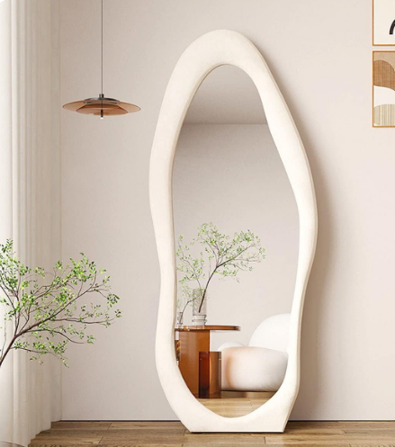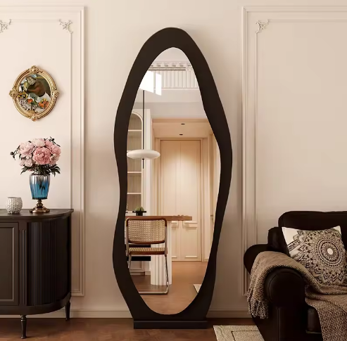 QandAHome’s Irregular Floor Mirror & Full Length Mirror. An irregular full-length mirror can be supported against the wall or can be hung on the wall to save space. You can put this mirror anywhere in the house; it is suitable for bedrooms, living rooms, dressing rooms, behind doors, hallways, clothing stores, etc. No matter where you put this mirror, it will make the space look more spacious and bright, improve the quality of the whole space, and is a great choice for home decoration! Just choosing us wall mounted or leaning against the wall full-length mirror will give you a great surprise in either the practical or decor part. The mirror is a modern statement piece designed to elevate any living space. Its fluid, asymmetrical shape adds an artistic touch while creating the illusion of a larger, brighter room. Perfect for bedrooms, living areas, or entryways, this full-length mirror blends contemporary style with practical functionality.