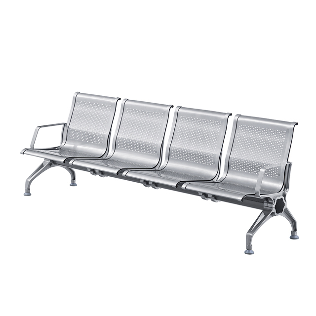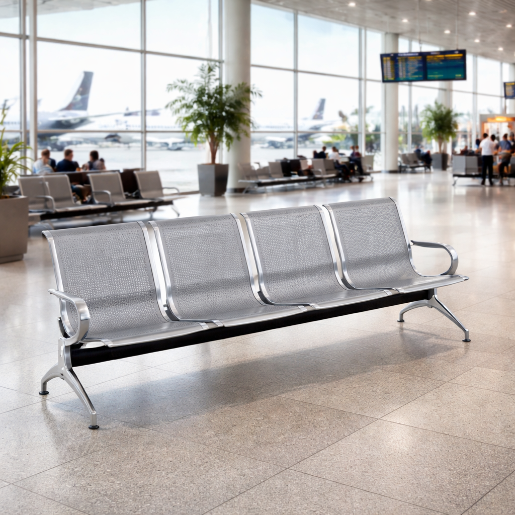 The QandAHome Metal 4 Seater Metal Bench features a sleek and modern design, perfect for a variety of settings such as airports, parks, or waiting areas.