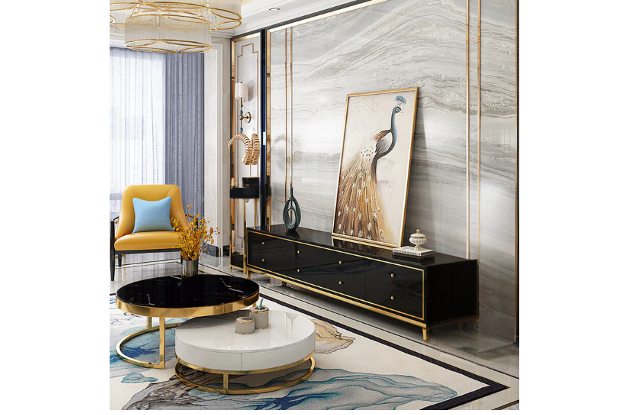 This elegant Living room set combines modern style with functionality. It features a unique coffee table with built-in storage. The sleek glass top, fluted surface, and gold accents make it a standout piece in any living room. Its nesting function saves space while maintaining a chic look. Tempered glass tops for a sleek and durable surface, sintered stone top, and a heat- and scratch-resistant stainless steel frame in a golden finish. The versatile nesting design allows for easy storage and flexible arrangement