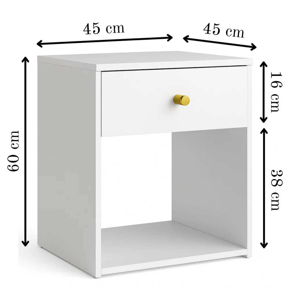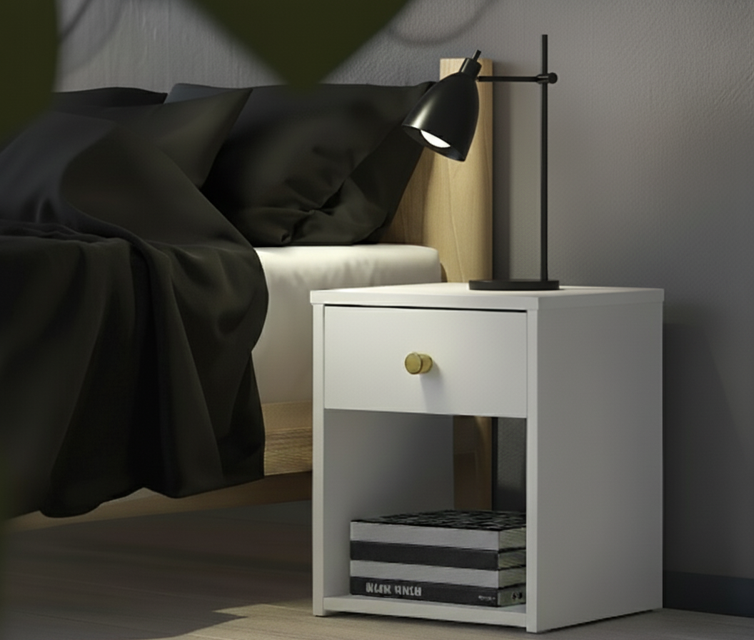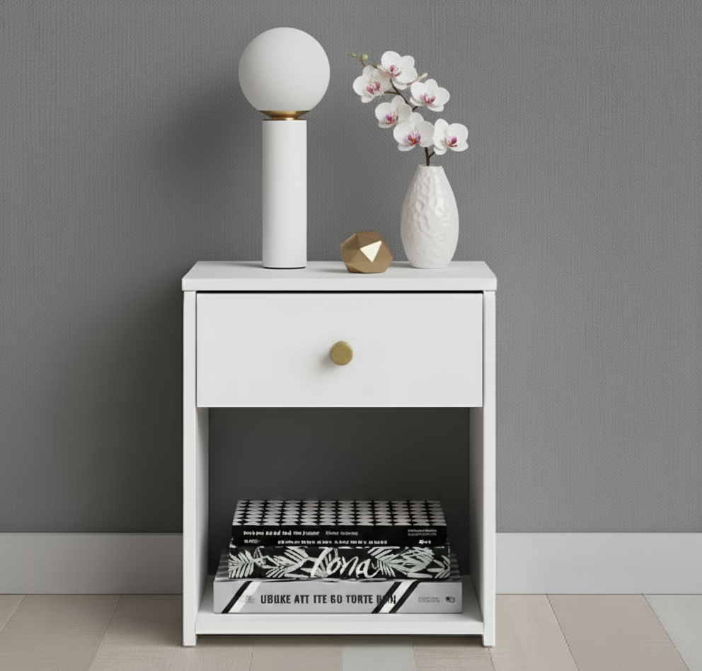 The Nate Bedside Night Stand brings together functionality and modern elegance in a compact design. Featuring a sleek silhouette with a refined gold knob handle, this piece offers a perfect balance of concealed and open storage. Its single smooth-glide drawer keeps your essentials neatly tucked away, while the spacious open shelf below is ideal for books, décor, or nighttime necessities. With its clean lines and versatile size, the Uni Night Stand complements both contemporary and classic interiors, making it a stylish addition to your bedroom or living space