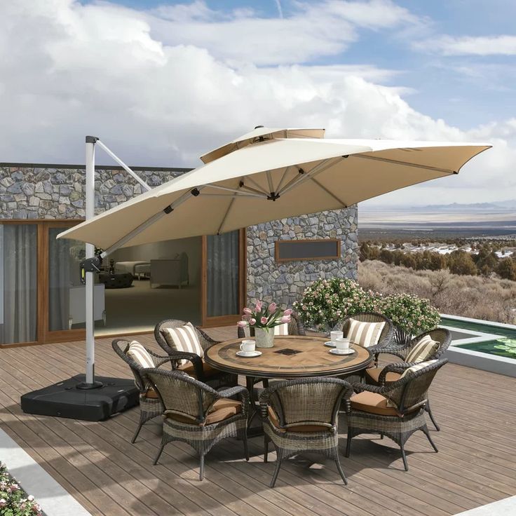 - This offset patio umbrella has a size of 3x3m and a larger canopy, perfect for tables of 6-8 people. The unique double-top umbrella design provides enhanced wind resistance and stability. The versatile patio umbrella is suitable for many scenarios, such as gardens, decks, streets, or weddings, business parties
