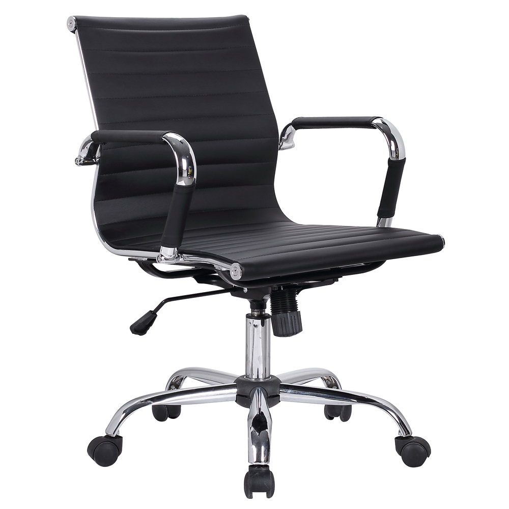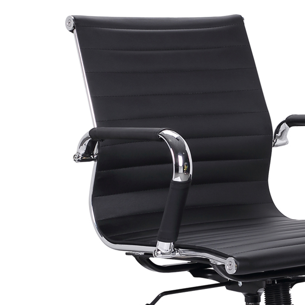 Experience a blend of classic design and modern comfort with the sleek AeroFlex black ribbed-back office chair from QandAHome. Designed to enhance any workspace, from a home office to a corporate setting, this chair features a timeless ribbed design that offers both style and ergonomic support. The supple black material provides a professional look, while the chrome-finished frame and armrests add a touch of modern sophistication. Its durable construction includes smooth-rolling casters for easy mobility and a sturdy base built to last. Adjust the chair to your ideal height with the simple lift mechanism, ensuring a perfect fit for your desk.
