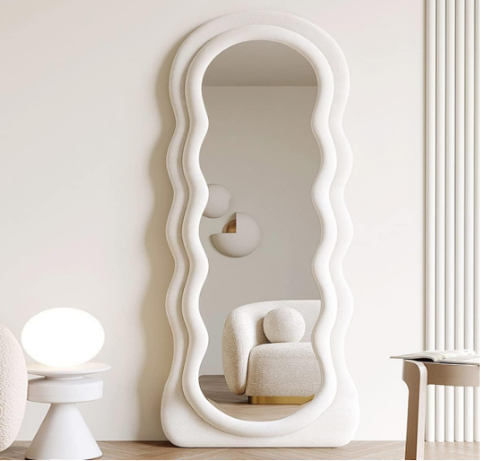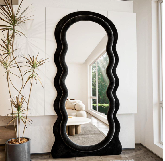 Wavy full-length mirrors are popular in modern interiors because their undulating frames add personality and artistic flair while still serving the practical purpose of a full-body mirror.