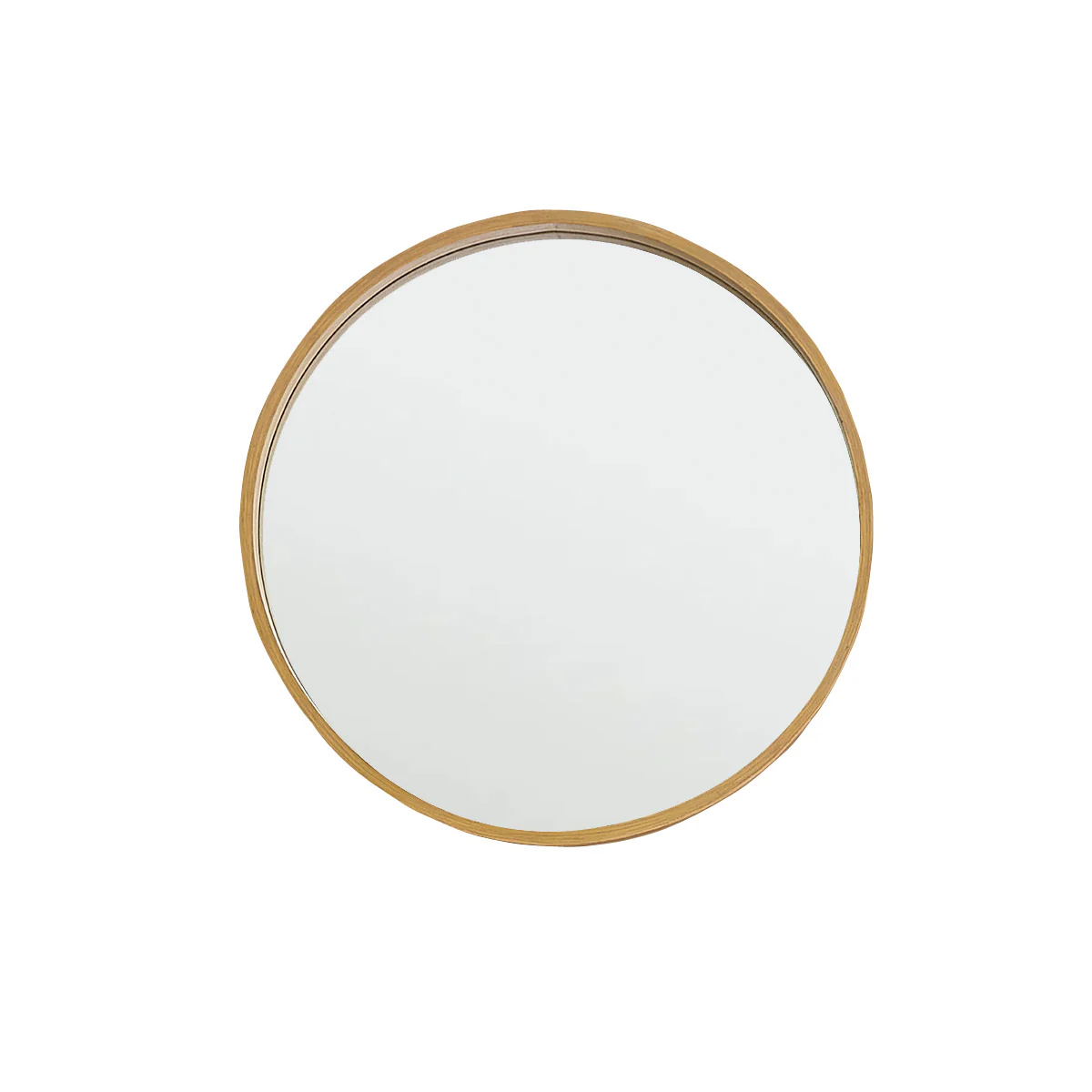 A modern round wall mirror with a natural frame, designed to add warmth and light to any space. Its minimalist style suits a variety of interiors, making it perfect for bedrooms, hallways, and living areas