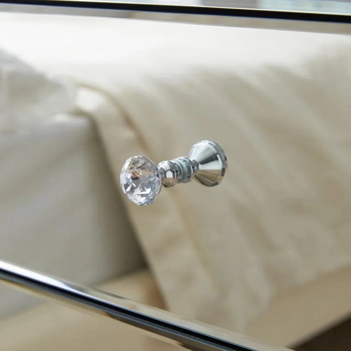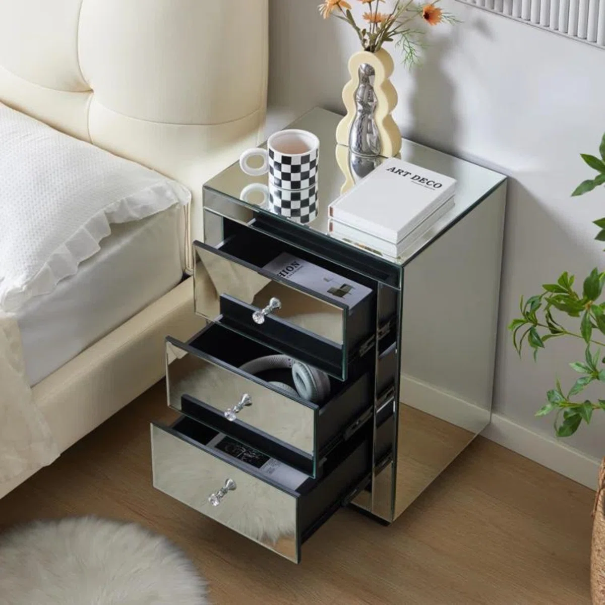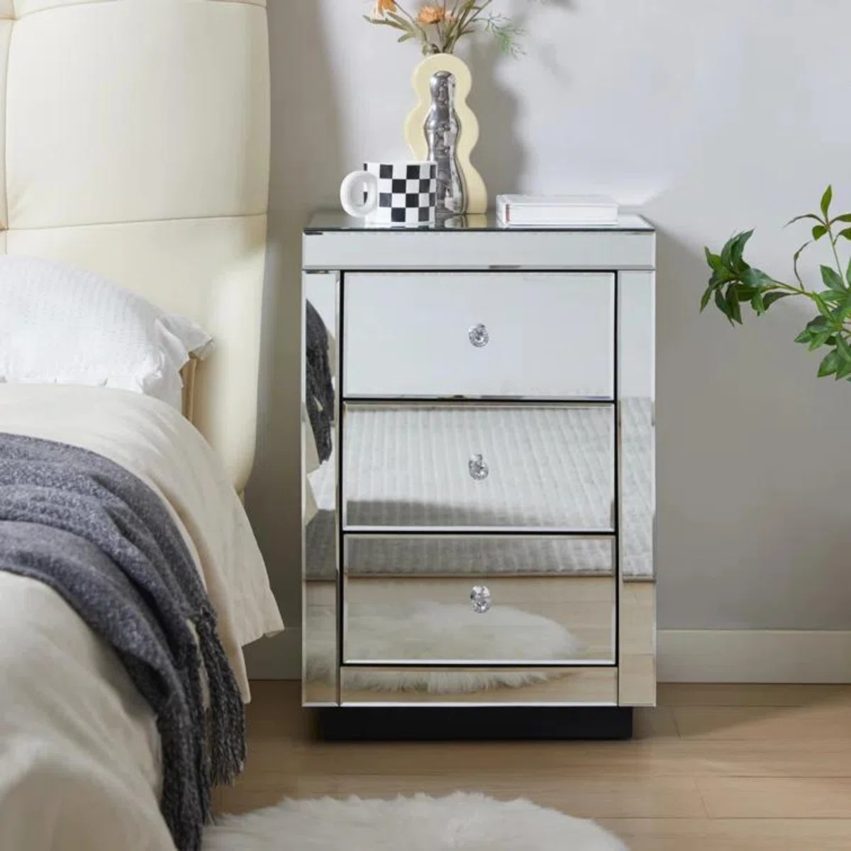Bring a touch of glamorous appeal to your bedside with this elegant and compact Salome nightstand. Founded on an environmentally friendly manufactured wood frame, this piece strikes a clean-lined rectangular silhouette lined with gleaming mirror plating and chic silver trim, while tasteful mouldings, crystal hardware, and block feet elevate, and round out the design. Three mirrored drawers offer plenty of storage space for keeping bedside essentials, while the beveled mirror tabletop is perfect for holding a table lamp or framed photo.